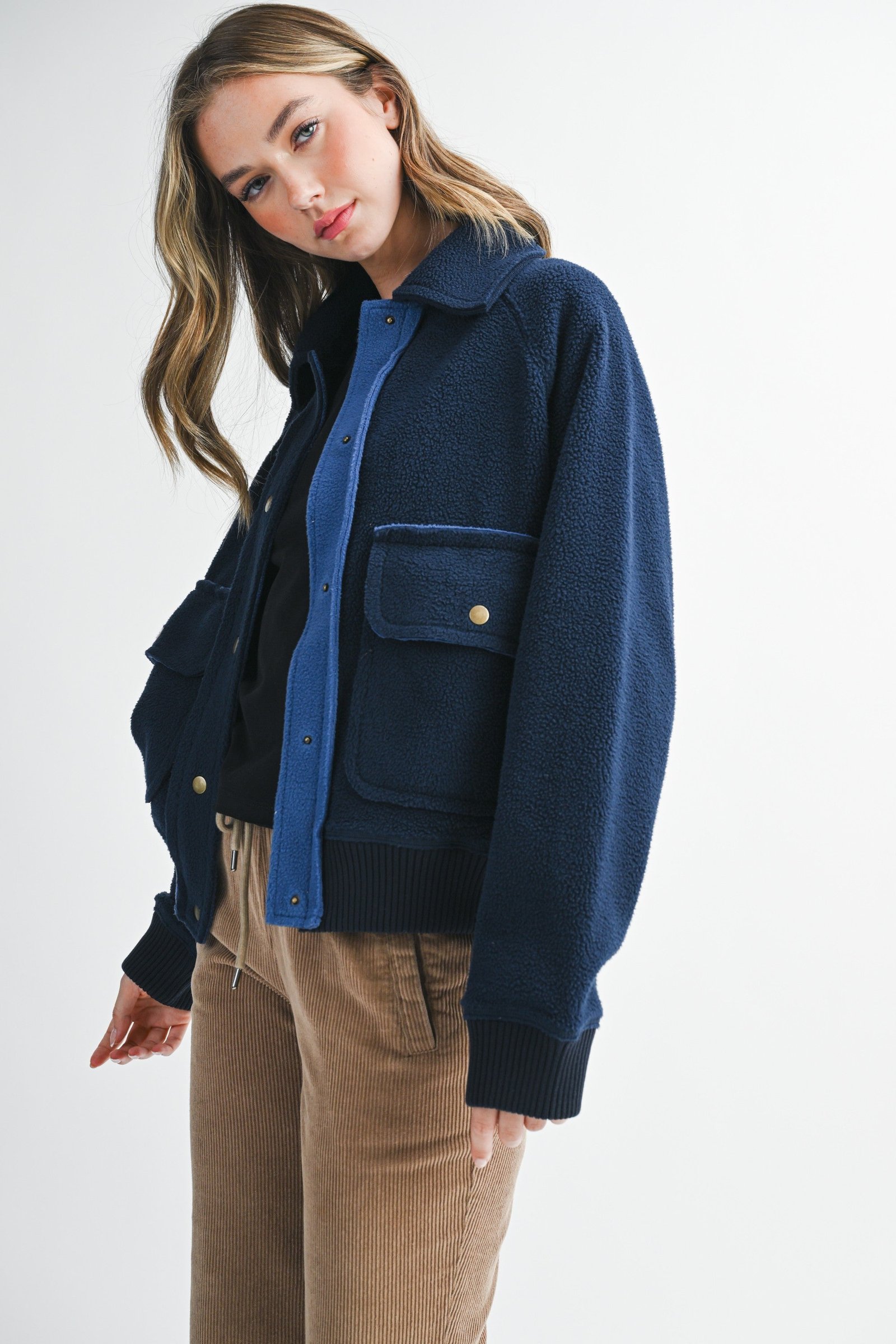This cropped sherpa jacket brings cozy texture and effortless edge to your cold-weather looks. She features a snap-button front, oversized patch pockets, and ribbed knit cuffs for an extra snuggly finish. Made from a plush and warm sherpa fabric, she’s your new go-to for layering with denim and boots.