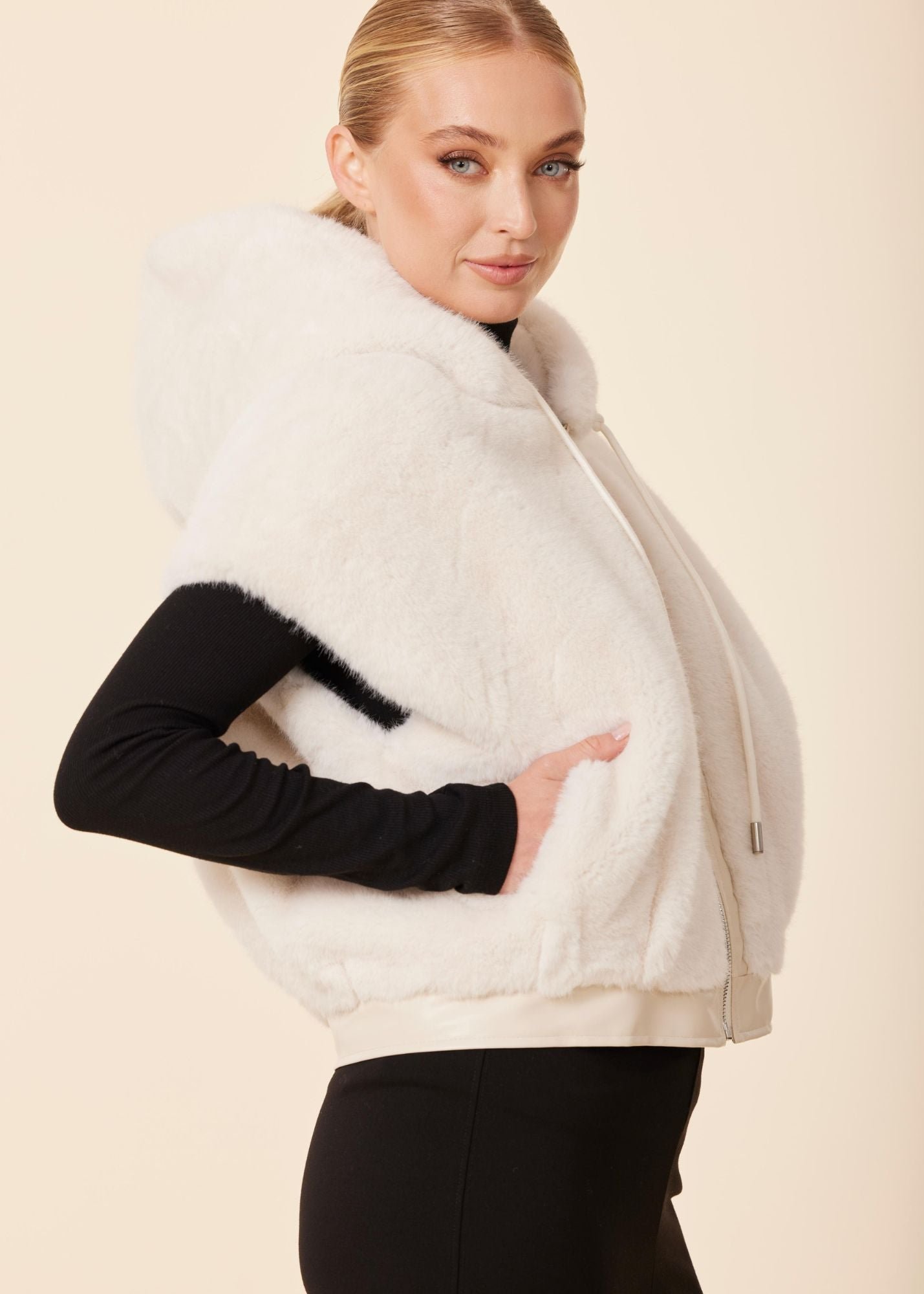 Elevate your layering game with this sophisticated faux fur hoody vest, expertly crafted from premium vegan leather trim. The plush faux fur exterior delivers luxurious warmth and texture, while the vegan leather accents add refined structure and durability. Perfect for transitional seasons, this versatile piece pairs effortlessly over lightweight sweaters or fitted tees. The hooded design provides extra coverage and style, making it an essential addition to any modern wardrobe. Cruelty-free construction meets contemporary fashion.